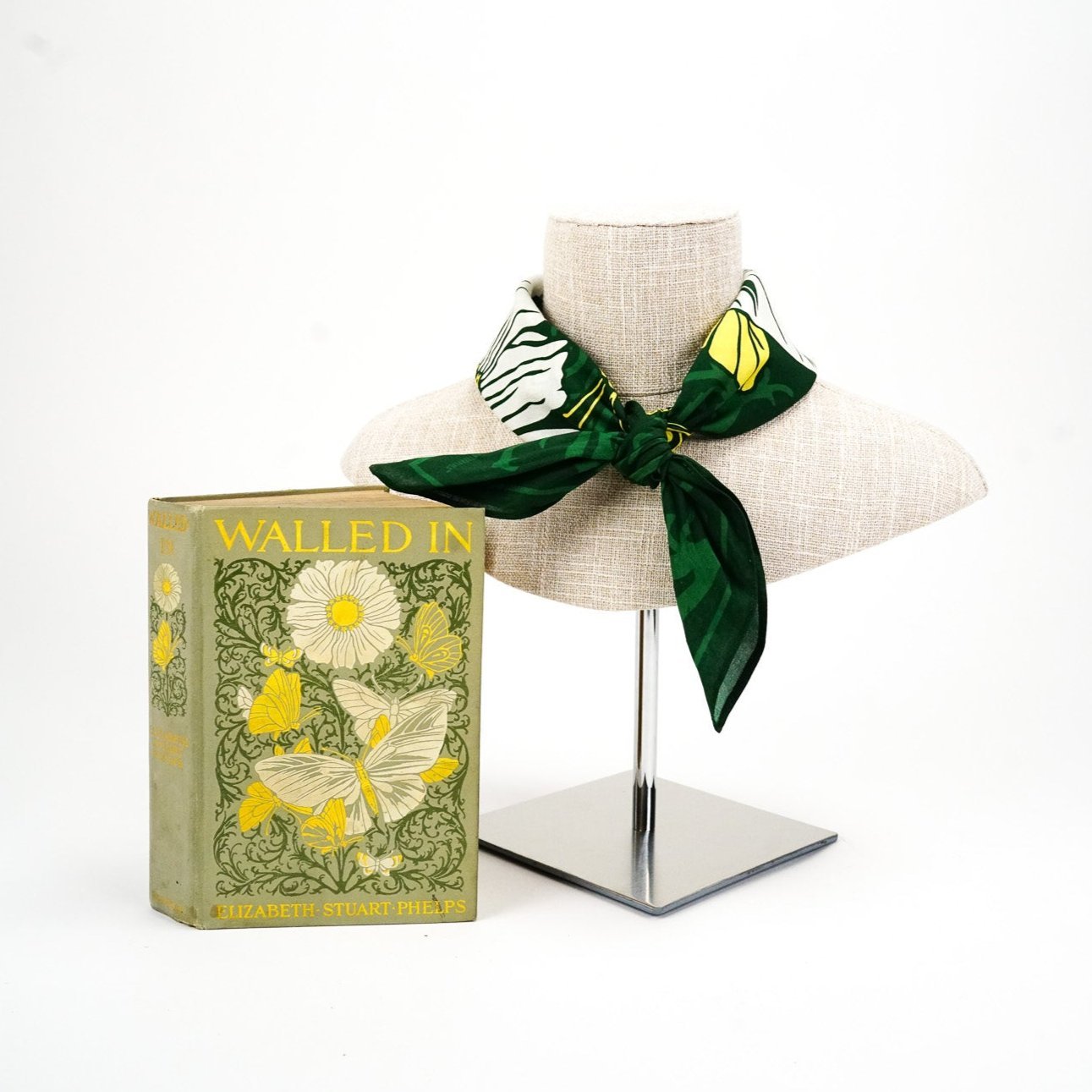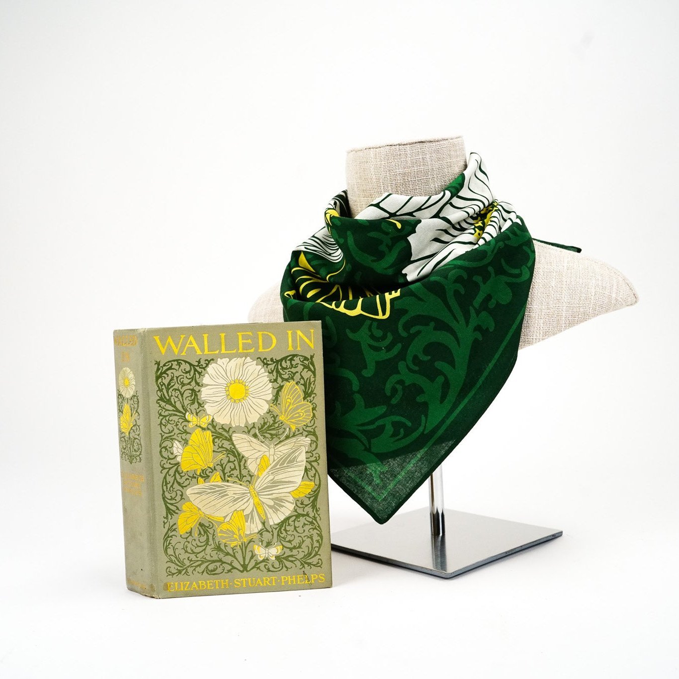 Delicate butterflies pop from the cotton canvas, stark white and yellow against a backdrop of forest green foliage. Add an earthy touch to your outfit sporting this grand bandana.